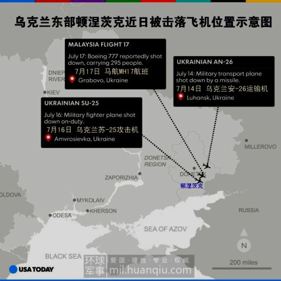 烏克蘭東部頓涅茨克近期被擊落飛機位置示意圖